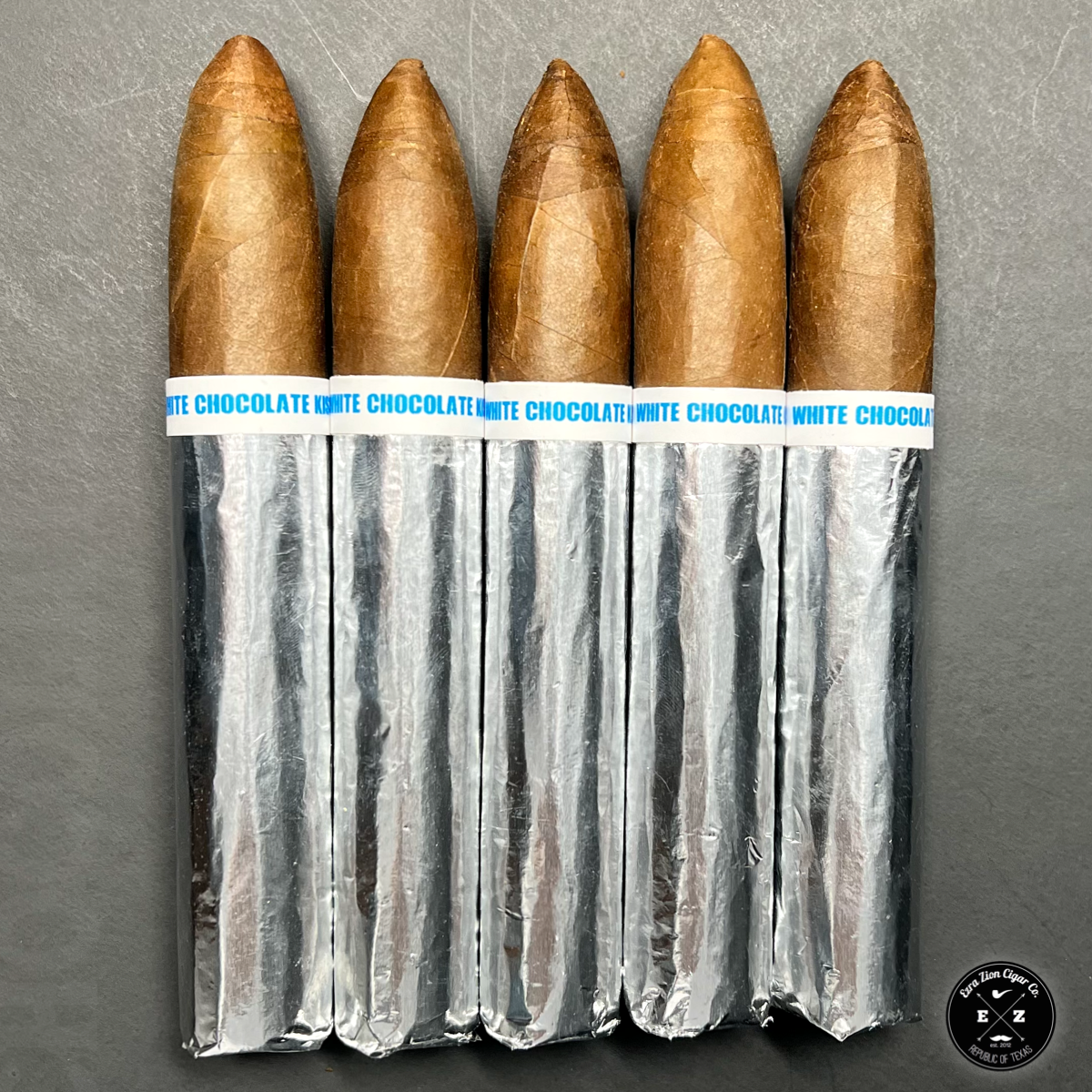 WHITE CHOCOLATE KISS is a full-bodied, med/full-strength 5.25x52 belicoso. The wrapper is an oily 9-year-aged Criollo Claro leaf. Binder and filler tobaccos will remain a closely guarded secret. All tobaccos are 5-13 years aged!