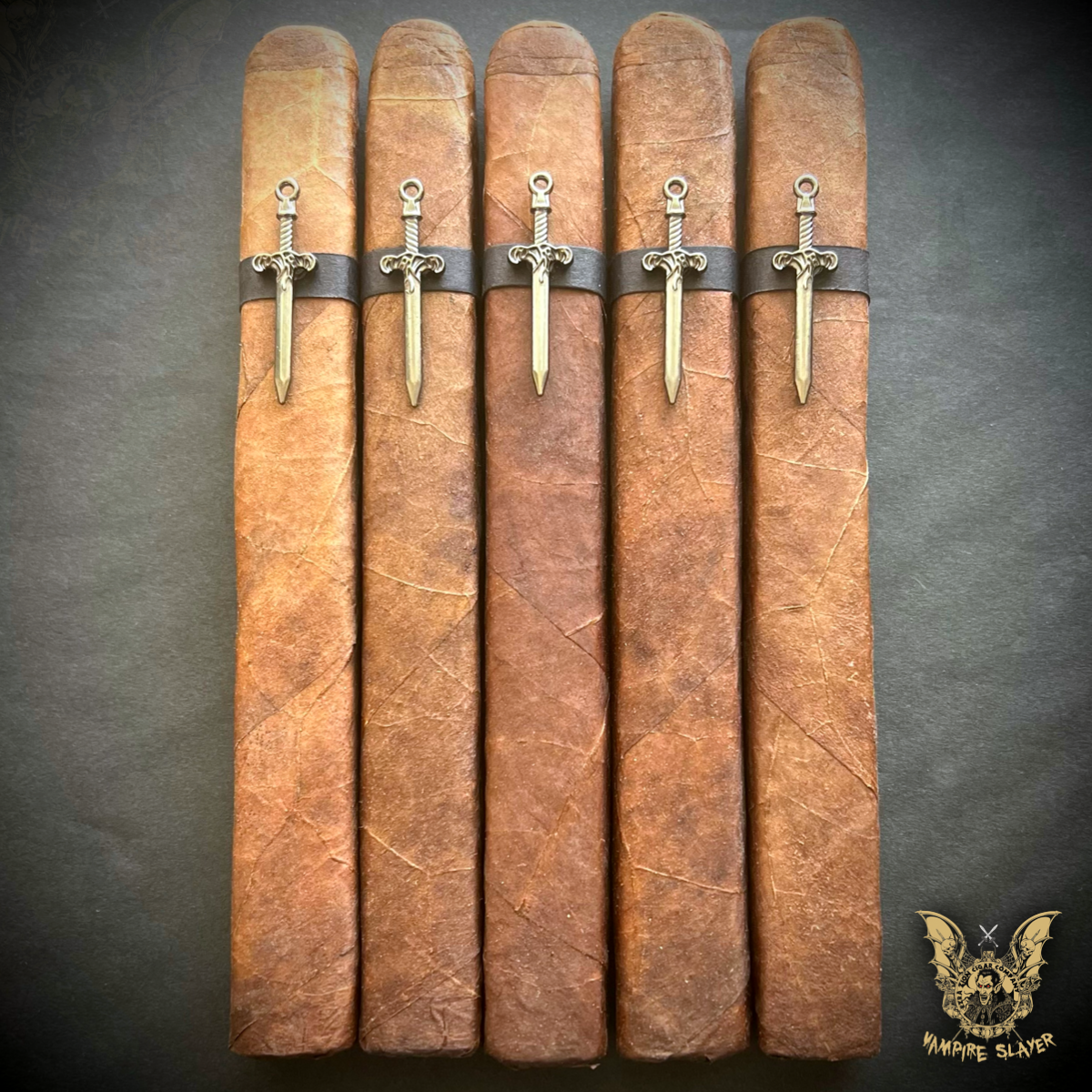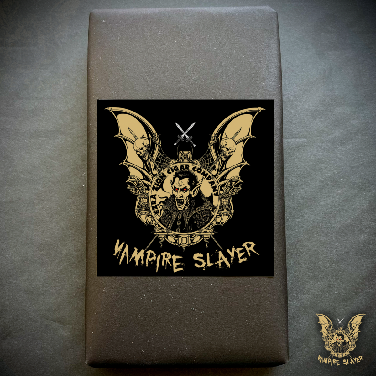 VAMPIRE SLAYER is a full-bodied, med/full-strength 6x48 box-pressed corona gorda.. The wrapper is a 10-year-aged Sumatra Maduro leaf. Binder and filler tobaccos will remain a closely guarded secret....but they are all 5-14 years-aged.